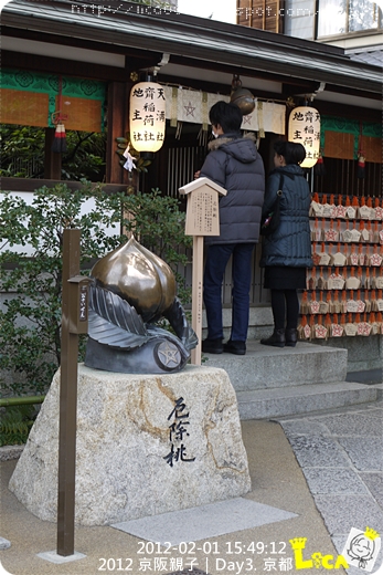 據說摸一摸便能消災解厄的厄除桃。大捲這天晚上在房裡看旅遊書時才注意到書上寫的晴明神社,一直唉唉叫說沒看到厄除桃,我還特地給她看了我拍的照片,她才相信。所以,之後因為巴士順路,所以我們又來了一趟~~為的是讓她摸摸桃子。